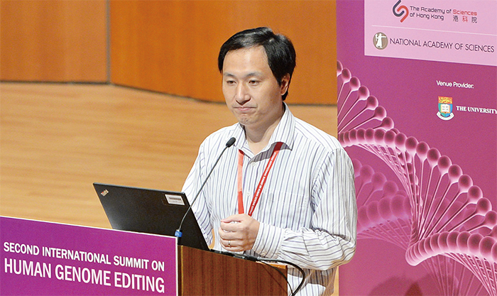 2018年11月28日,深圳南方科技大學生物系副教授賀建奎,在香港第二屆人類基因組編輯國際峰會上公布基因編輯嬰兒已經出生,引發全球科學界普遍譴責。(宋碧龍/大紀元)
