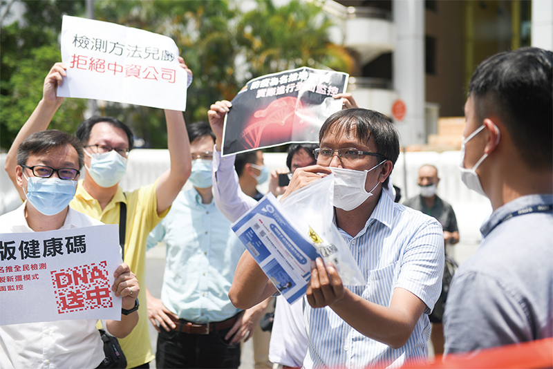 政府欲推全民自願檢測計畫,2020年8月16日,香港多名區議員到位於中山紀念公園體育館外設立的華大基因實驗室抗議全民檢測成效存疑。(爆炸頭/大紀元)