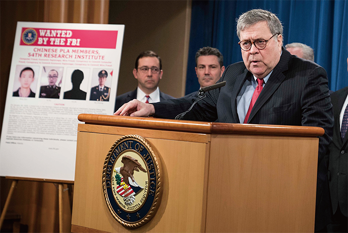 2020年2月10日美國司法部長威廉.巴爾(William Barr)指4名中共軍方黑客入侵美國信用報告機構Equifax,竊取半數美國人個人信息,是「有組織、無恥的刑事搶劫」。(Sarah Silbiger/Getty Images)