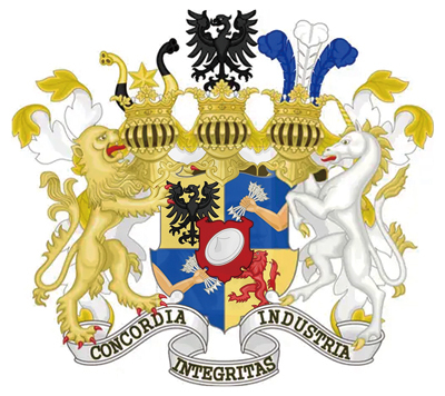 羅斯柴爾德家族曾經主宰歐洲和美洲金融世界長達200年。在當代歐洲五大強國之外,該家族被稱為「第六帝國」。圖為由奧地利皇帝弗朗茨一世授予的羅斯柴爾德家族家徽。(維基百科)