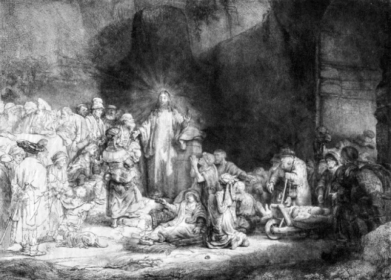 林布蘭特銅版畫〈耶穌與圍繞著祂的病人們〉(Christ with the sick around him),1647至49年。(公有領域)