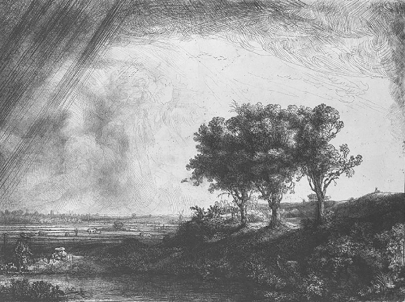 林布蘭特銅版畫〈三棵樹〉(The Three Trees),1643年。(公有領域)