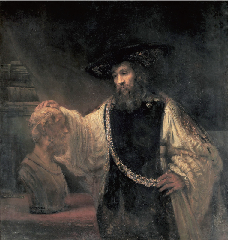 林布蘭特〈亞里斯多德對著荷馬詩人雕像沉思〉(Aristotle with a Bust of Homer),1653年。(Metropolitan Museum of Art)