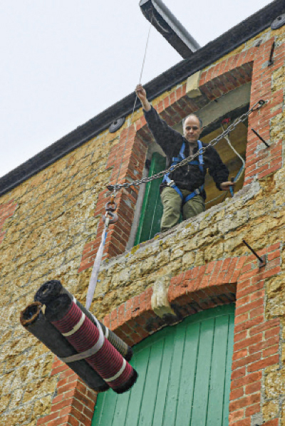 John Boyd Textiles的工人將馬毛布料從窗戶運送下樓。