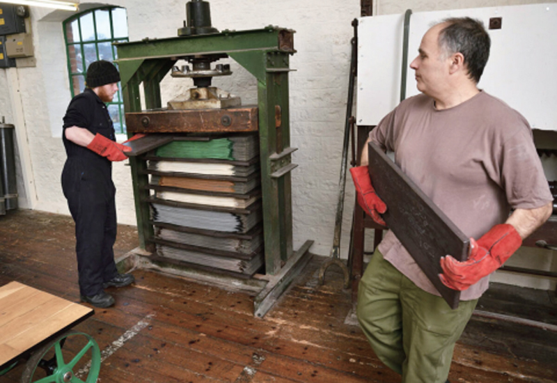 工人正在整備裝滿馬毛布料的壓平機。(Rob Scott / John Boyd Textiles Ltd.)