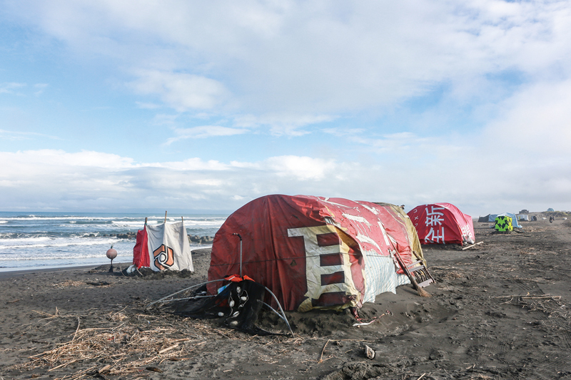 海報隨意覆蓋在沙灘上零散分布的簡陋「蒙古包」上,那是漁民為撈捕鰻苗臨時搭建的棚子。蒙古包旁,一位漁民正在補破網。