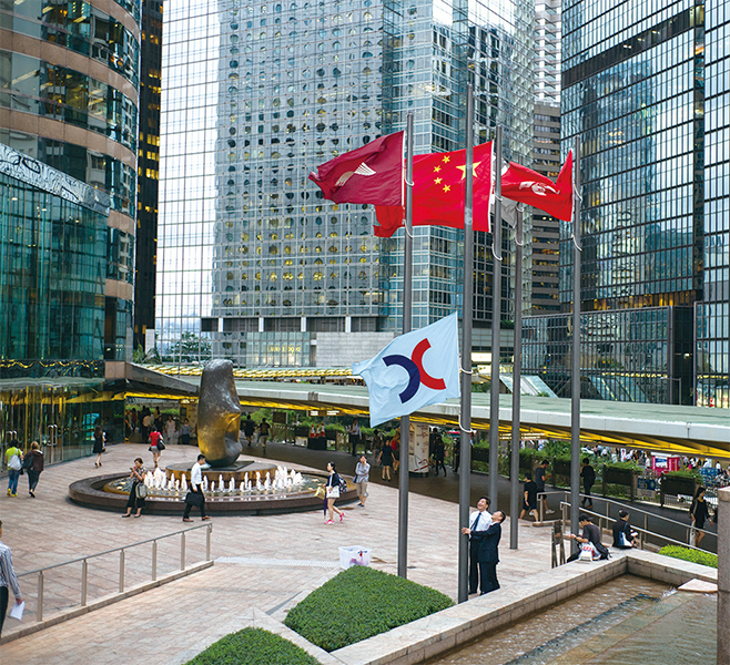 疫情下中國超發了很多貨幣,房地產這個第一個資金蓄水池已滿溢,股市證券等資本市場成為新的資金蓄水池,通過香港吸引國外資金。圖為香港交易所外的飄掛五星血旗。(Anthony Wallace / AFP)