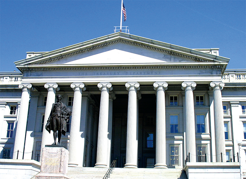 美國10年期公債飆升,預示著美國可能提前進入加息期,讓美元變得更堅挺,那出去的資本就會回到美國。圖為美國財政部。(Karen Bleier/AFP)