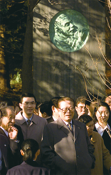 魯迅病逝時宋慶齡為他披上「民族魂」的旗幟,不過後來在魯迅故居題寫「民族魂」的卻是江澤民。圖為1998年11月29日江澤民訪日時參觀仙臺市博物館魯迅紀念碑。(Katsumi Kasahara / AFP)
