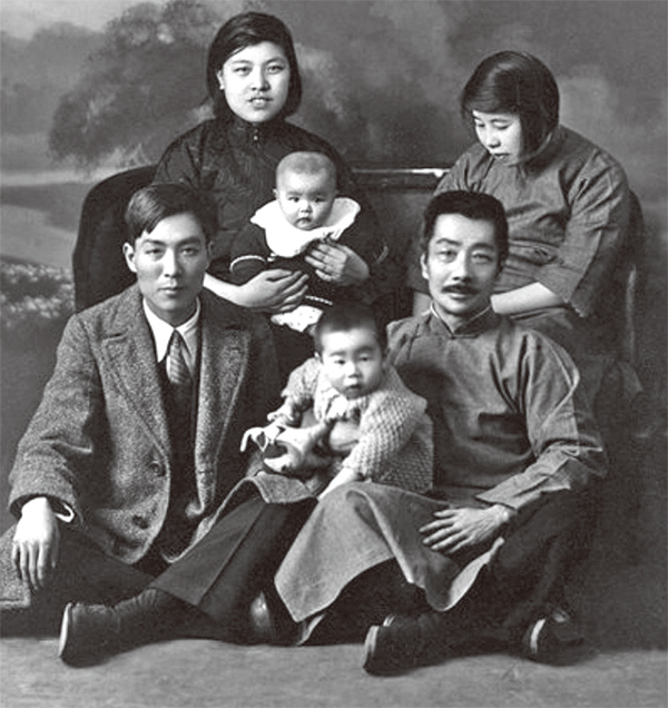 1931年4月20日,魯迅全家與馮雪峰(前排左一)全家攝於上海。魯迅抱著的孩子是周海嬰,身後是其伴侶許廣平。(公有領域)