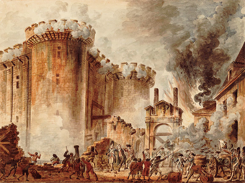 法國大革命是法國的一段社會激進與社會動盪時期,對法國歷史及全歐洲都留下深刻的廣泛影響。圖為巴黎人民1789年7月14日首次武裝起義,攻占巴士底監獄。(公有領域)