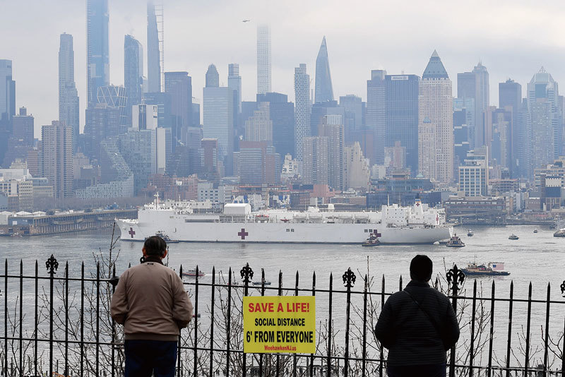庫默在疫情初期抱怨床位不足,特朗普迅速派遣軍用醫療艦舒適號(圖)至紐約港。紐約呼吸機嚴重不足時,特朗普又啟動《國防生產法》,使呼吸機得到充分供應。(Angela Weiss / AFP)