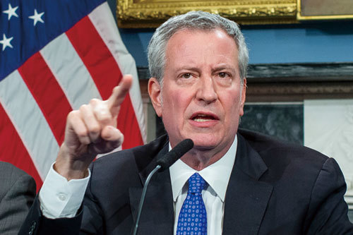 紐約市長白思豪(圖)及民主黨內最激進的眾議員歐加修-寇蒂茲(暱稱AOC)都在「追捕」庫默。白思豪說,很多政治同僚和媒體都被庫默喝斥侮辱過。(Eduardo Munoz Alvarez/Getty Images)