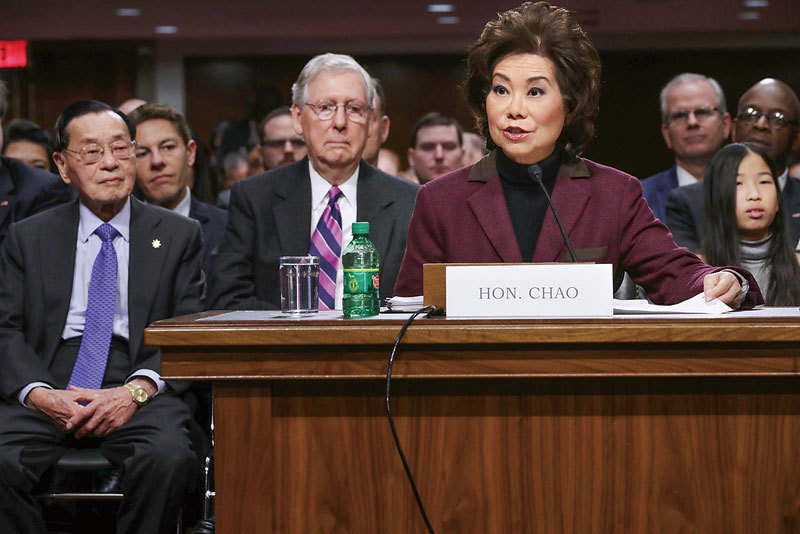 2017年1月11日趙小蘭的任命聽證會上,她完全沒有提及她的家族與中國航運業的廣泛聯繫,並多次談到要振興日趨衰敗的美國航運業。當時她父親就坐在她身後。(Chip Somodevilla/Getty Images)
