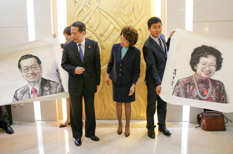 由於是江澤民的校友,趙錫成在中國大陸可謂手眼通天。圖為2018年4月27日趙小蘭(中)訪中時,中共交通運輸部長李小鵬送上她父親趙錫成及母親朱木蘭的肖像做為見面禮。(Jason Lee / AFP)