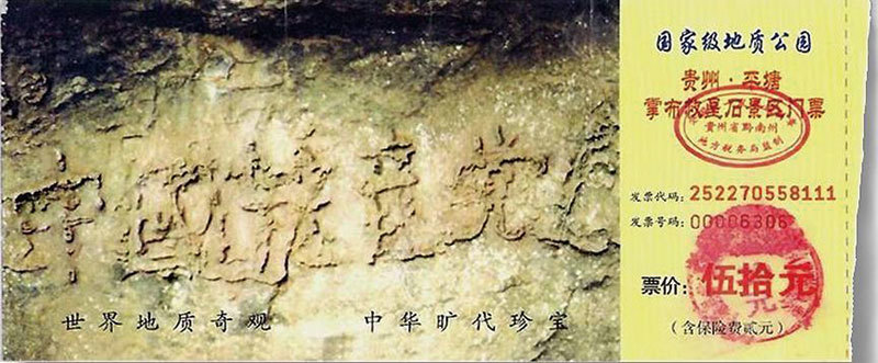 貴州省平塘縣發現2.7億年前形成、500年前崩裂的「藏字石」,上面有「中國共產黨亡」六個大字。圖為貴州平塘掌布鄉國家地質公園門票。(明慧網)
