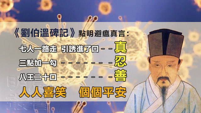 在〈碑記〉結尾,劉伯溫用拆字的方式,像謎一樣,告訴人們最為寶貴的三個字「真、善、忍」。從2020年初至今,全球各地已有很多中共病毒感染患者因念「法輪大法好、真善忍好」而獲得完全康復,明慧網上刊載很多這樣的典型案例。