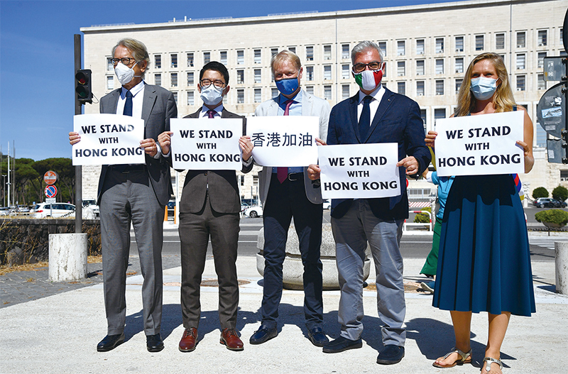 意大利參議員馬蘭(中)說,若沒有中共當局的縱容,完全不可能發生這樣的攻擊。圖為馬蘭2020年5月25日與流亡海外的香港民運人士羅冠聰(左二)合影。(Tiziana FABI / AFP)