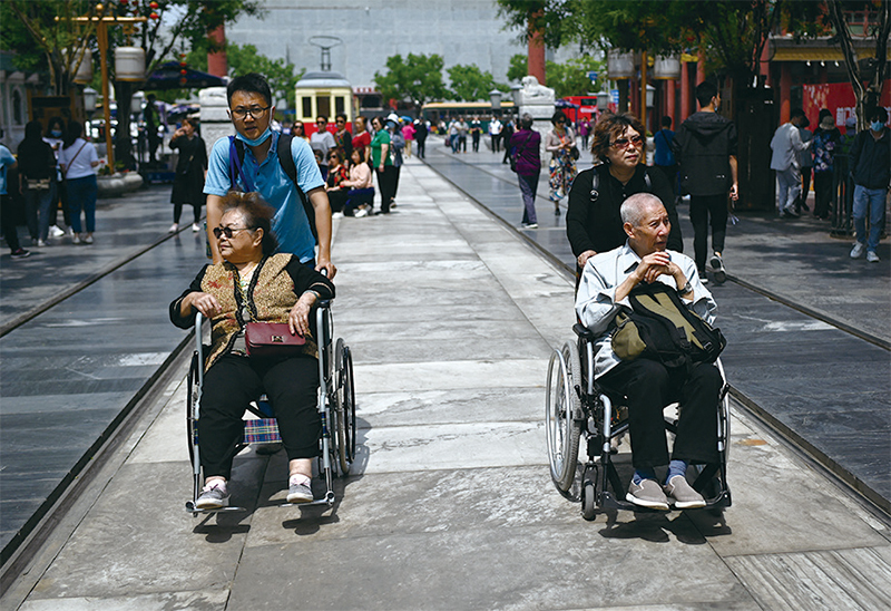 人口老齡化最直接的結果就是使得社保收支矛盾日益突顯,養老金缺口將日益增加。圖為2021年5月11日北京一對坐在輪椅上的老人。(Wang Zhao/AFP)