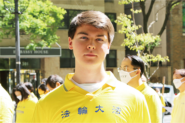 一位紐約上州哈德遜河谷地區的青年克里斯(Chris Bob),手持一本英文《轉法輪》書模型,走在遊行隊伍裡。他說,這本書徹底改變了他的人生。三年前,克里斯在一個法輪功學員開的小店裡,收到一朵帶有法輪功網址書籤的小蓮花,從此他就開始修煉了。