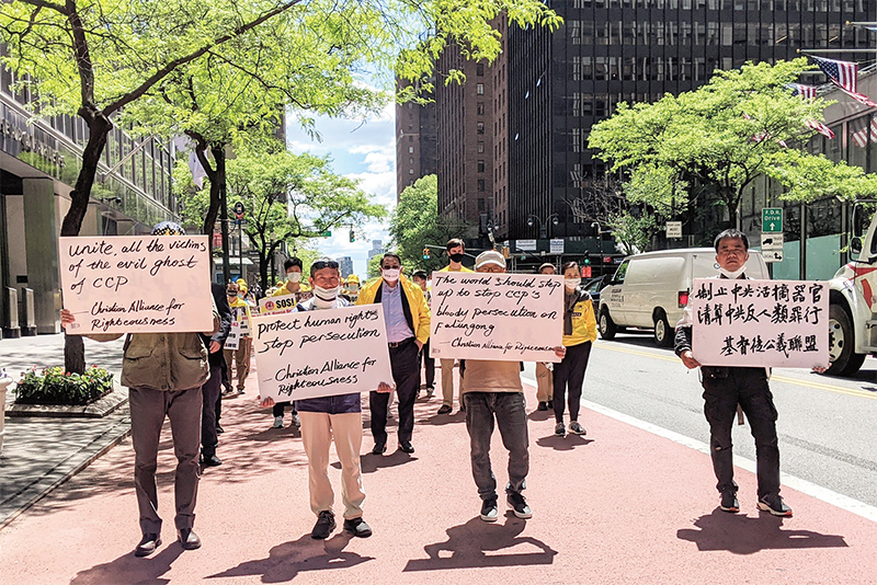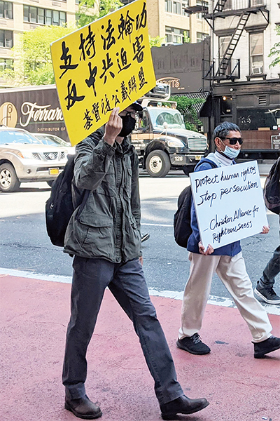 2021年5月13日,紐約市基督徒公義聯盟成員感佩法輪功學員為義受逼迫,來到曼哈頓,舉「支持法輪功」標語與法輪功學員一同遊行。(黃小堂/大紀元)