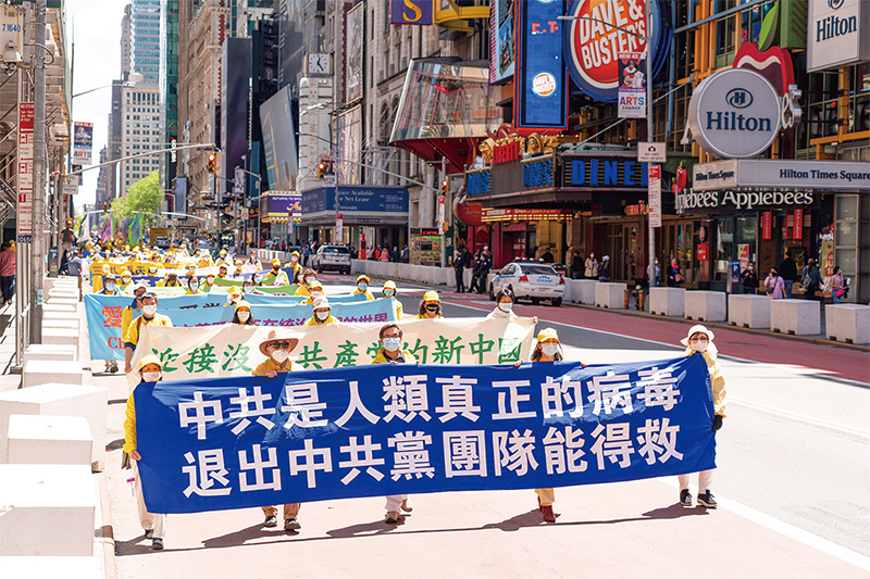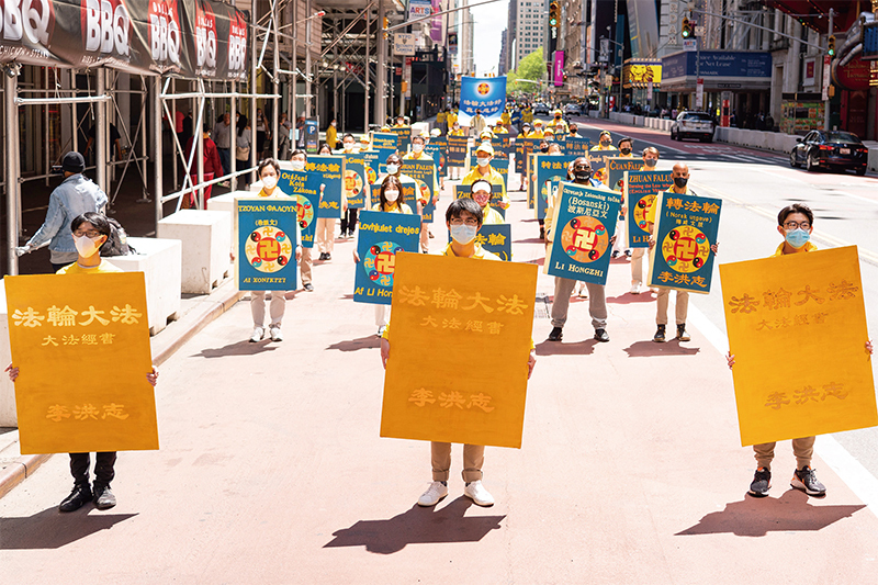 2021年5月13日,大紐約地區部分法輪功學員在曼哈頓舉行盛大遊行活動,慶賀第22屆「世界法輪大法日」。(戴兵/大紀元)