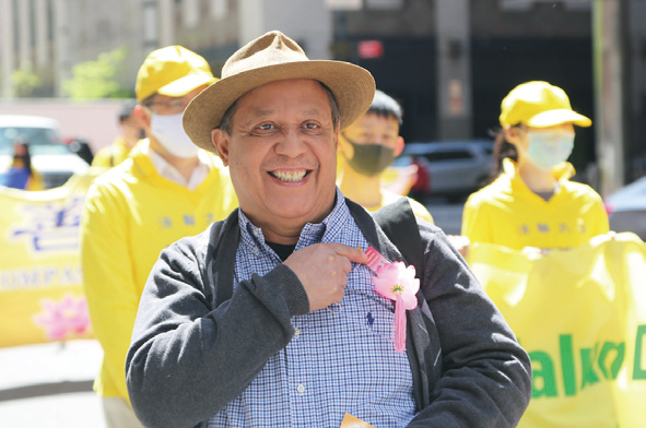 在一家職業安全學校供職的本內泰茲(Anthny Benitez)開心地從法輪功學員手中接過了一朵粉色的小蓮花,他特意地將蓮花別在胸前。近來身體有恙的他說,看到遊行,感覺找到了心中的寧靜。「『真、善、忍』,你還要比這更好的東西嗎?我們太需要了,這是世界上人人需要的價值觀。」本內泰茲說,「我被祝福了,我很快樂,雖然我過去的生活不容易,但是我很高興我能站在這裡,事實上我比我剛才還要高興。」