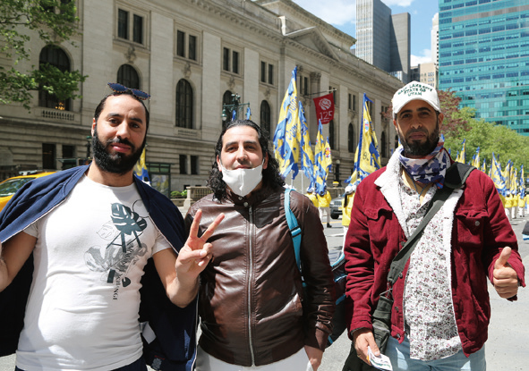 設計師蘭姆齊(Ramzi,右)與兩位好朋結伴在曼哈頓第42大道上,觀看遊行。他說,他也要學法輪功。(施萍/大紀元)