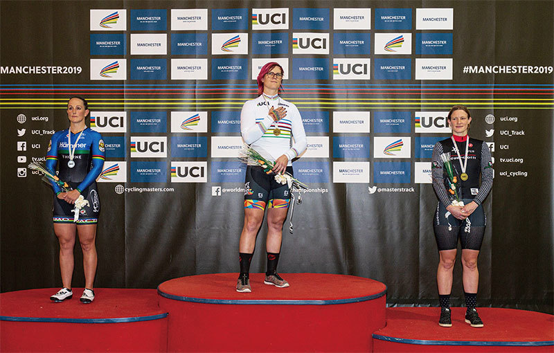 圖為加拿大跨性別單車選手瑞秋.麥金農(中)於2019年10月19日參加UCI自由車場地賽世界錦標賽女子組獲得金牌。