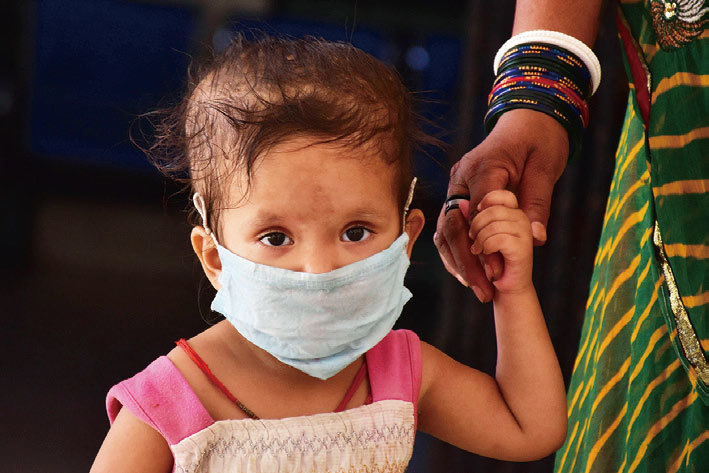 兒科文獻表明,兒童感染新冠的風險非常低或極其罕見(接近零)。圖為2021年5月8日,印度一家醫院裡,戴著口罩的兒童握著母親的手。(Uma Shankar Mishra/AFP)