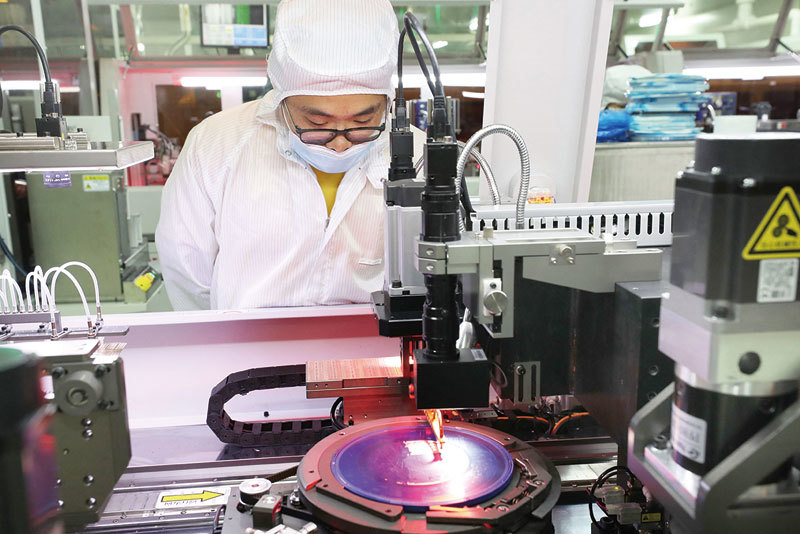 在未來5至10年內,中共不太可能獨立製造半導體。圖為2021年3月17日,一位員工正在江蘇南通捷捷電子公司的芯片生產線上工作。(STR / AFP)