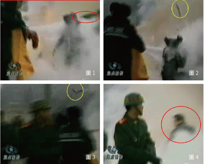 從中央電視臺《焦點訪談》錄像回放,清晰可見劉春玲不是被燒死,而是被被打死的。圖1. 凶手猛擊劉的頭部;圖2. 一條狀物彈起;圖3. 劉觸摸被擊打部位;圖4. 穿軍大衣的凶手保持用力姿勢。(明慧網)