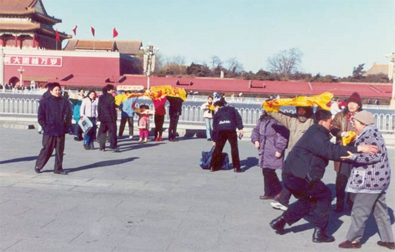 2000年12月天安門廣場,便衣奔向祥和舉著法輪功橫幅的善良老人、青年和孩子。(明慧網)