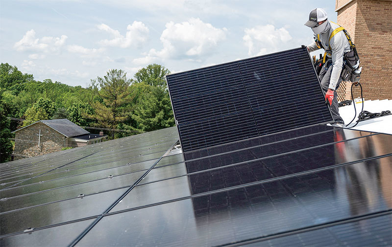 製造太陽能板的過程中,會消耗大量的傳統能源,包括煤炭和石油,一樣製造大量污染。圖為2021年5月17日美國弗吉尼亞州亞歷山大市一名工人正在安裝太陽能板。(Andrew Caballero-Reynolds/ AFP)