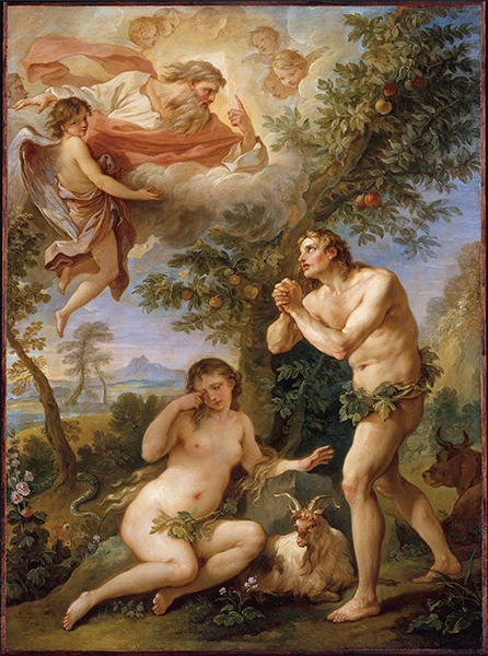 亞當和夏娃被上帝驅逐出天堂後,人類所有的期盼就是回返天國,回返那失去的樂園。圖為查理斯.約瑟夫.納托爾(Charles-Joseph Natoire)〈亞當和夏娃的斥責〉,1740年。(公有領域)