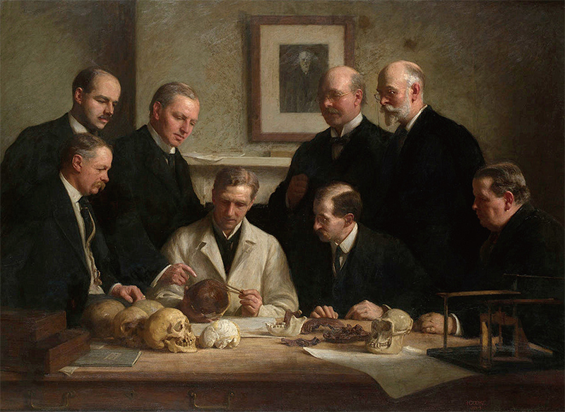 皮爾當人是20世紀著名的化石偽造事件中命名的古人類名稱。查爾斯.道森(Charles Dawson,圖中後排右二)宣稱發現了古人類顱骨與下顎骨化石,事實上是將人類頭骨和像猿的頜骨拼在一起。圖為1915年約翰.庫克的描繪畫作。(公有領域)