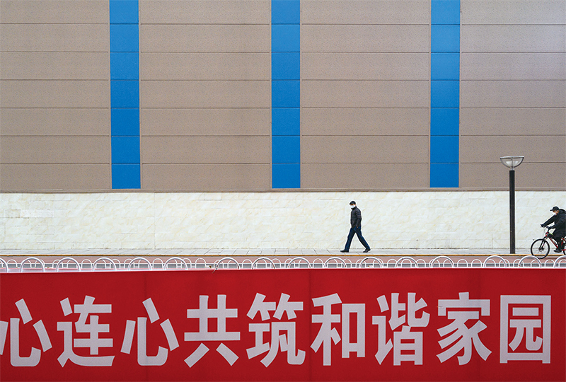 共產主義無神論體系若沒國家暴力為後盾,對國民強行洗腦和灌輸,面對邏輯嚴謹、道德完善的神傳文化體系,無神論根本不可能具備文化優勢。圖為2020年2月18日北京一街道掛的中共宣傳橫幅。(Kevin Frayer/Getty Images)