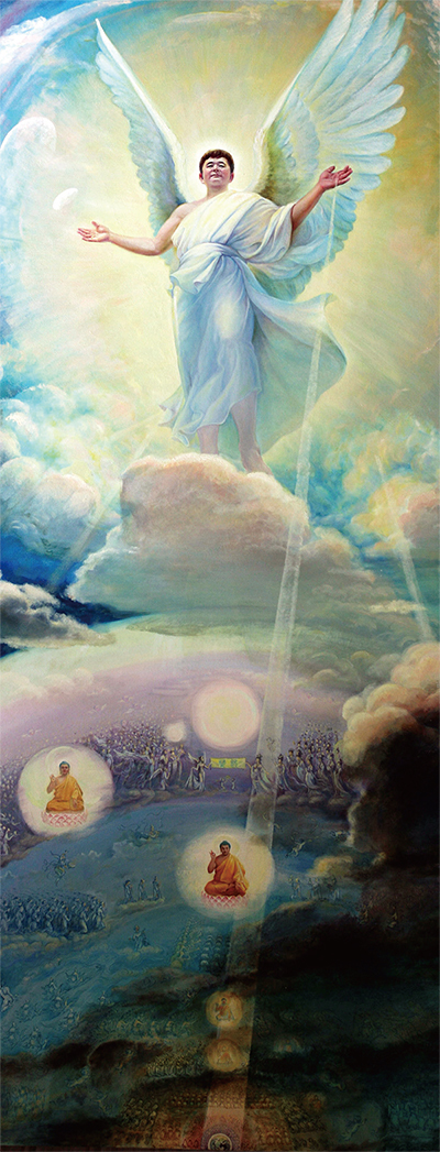有關人類的起源,從古到今,共有三種說法,一是神創論,二是進化論,三是外星人創造論。圖為張昆崙油畫作品〈主佛降臨〉。(法輪大法弟子藝術中心)