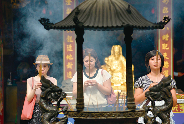 神傳文化體系人們在其中的體驗豐富而真切、不斷見證著神傳文化的真實和高貴,更能體現神對人類的救贖計畫。圖為臺灣廟宇前虔誠祈拜的民眾。(Chris Stowers/AFP)