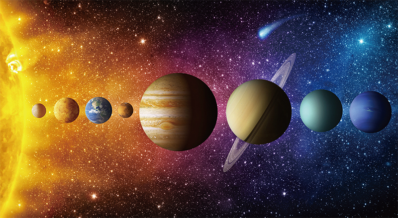 再看看地球之外的宇宙,以太陽系為例,每個行星圍繞太陽旋轉,軌道分布絲毫不差。圖為太陽系行星,彗星,太陽和恆星。(shutterstock)