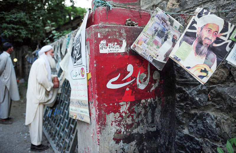 從本拉登1996年把基地組織從蘇丹轉移到阿富汗,到2001年為止,塔利班一直給他提供庇護。圖為2011年5月15日,巴基斯坦阿伯塔巴德的一個報攤上,民眾閱讀本拉登被美國海軍突擊隊的擊斃的新聞。(Asif Hassan/AFP)
