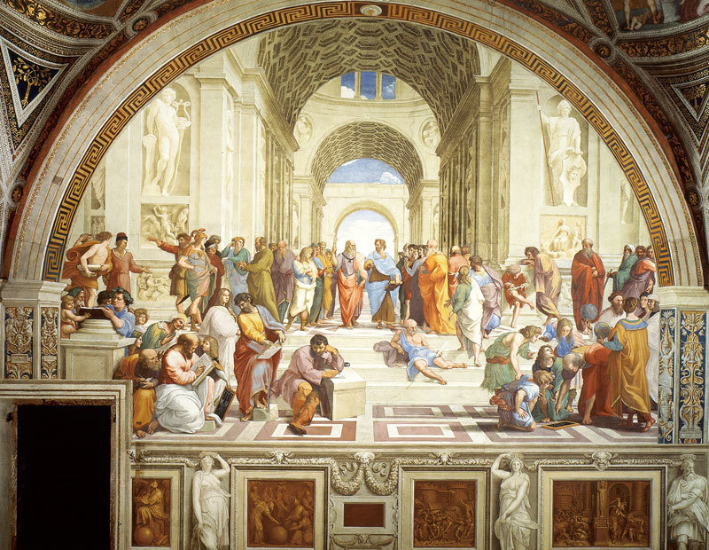 拉斐爾完成此畫時才26歲,除了純摯又熟練的掌握溼壁畫的繪畫技巧,他把上古希臘人對人文七藝知識的追求融合在一個以基督教為主導的世界,在教皇的簽署辦公之地。沒有違和,兼容並蓄又和諧,知識與精神交融在一起的理想世界。近六十個人物,幾乎囊括在他之前時代對西方文化有影響力的宗師,在縱深高大的建築拱門藍天下的〈雅典學院〉裡進行唯物、唯心之爭。畫中人物呈現自由又優雅的氛圍,即使是一群詭辯家,衣不蔽體的第歐根尼(古希臘犬儒派)。他是如何做到的?