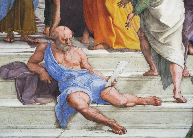 古希臘犬儒派哲學家,衣不蔽體的第歐根尼。拉菲爾〈雅典學院〉局部。(公有領域)