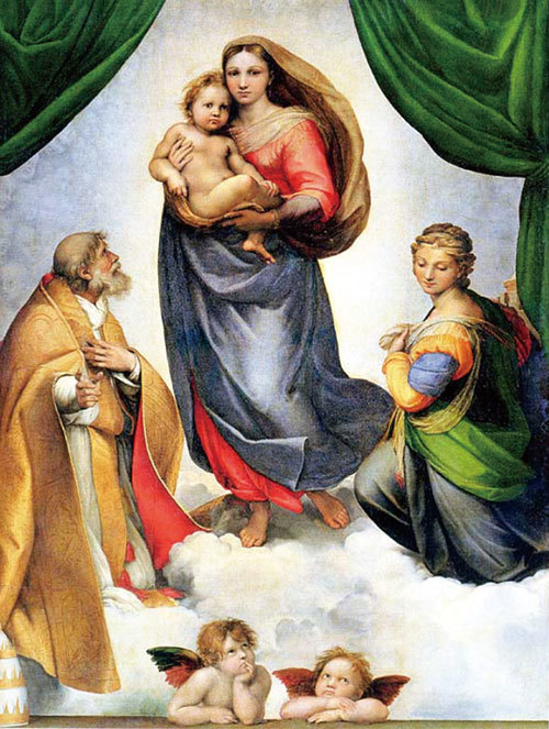 〈西斯廷聖母〉完成於〈雅典學院〉之後一年,是拉斐爾最著名的作品之一,尤其是畫作下方的兩個小天使(Putti)被複製成各式各樣的商品,從明信片到咖啡杯、領帶,凡我們能想得到日常生活的小東西。而這幅畫的身世坎坷。該作品於1754年,由當時薩克森國王奧古斯都三世購得,並放在有「易北河旁的佛羅倫斯」之稱的德勒斯登(Dresden)。二次大戰德國戰敗,德勒斯登遭盟軍報復性轟炸了三天三夜。這個建於18世紀美麗的巴洛克城市幾乎全毀,拉斐爾的這幅名作下落不明,後來才發現被紅軍帶到莫斯科去了。二戰結束,歷經12年,蘇聯才把這幅畫還回當時共產東德的德勒斯登國家畫廊。