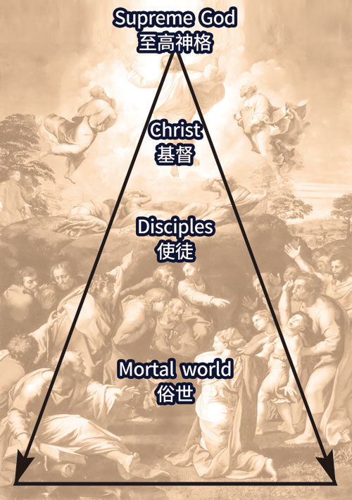 用中國畫多重視點的論述來解讀〈基督變容〉,三角形的頂端是至高神格,上層是基督,中層是使徒,底層表現俗世。(農生提供)