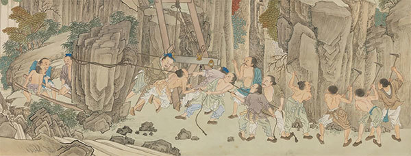 舜帝時降雨量大增,淹死很多人,最後只能由大禹來處理解決問題。圖為清 謝遂〈仿唐人大禹治水圖〉局部(公有領域)。
