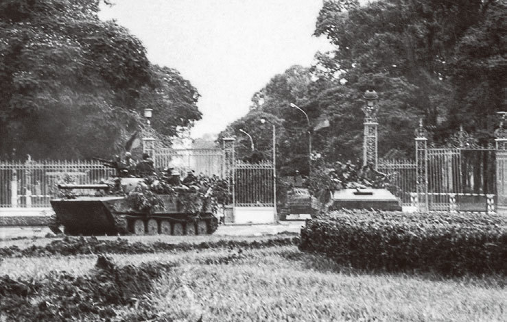 1975年,越共發起攻擊,4月30日日正式占領西貢。圖為越共軍隊占據總統府。