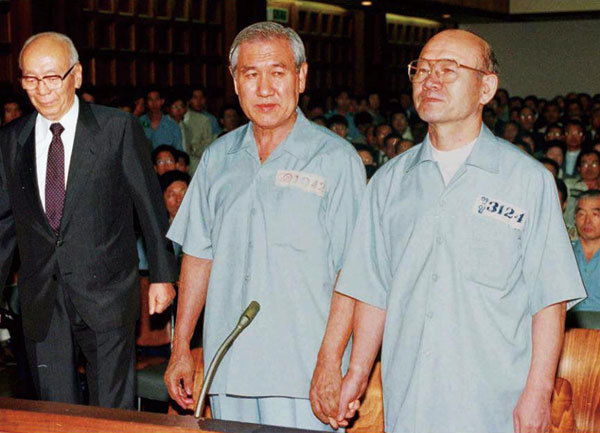 1996年8月26日,韓國前總統盧泰宇(中)和全斗煥(右)在首爾地方法院等待判決。(STR/AFP)