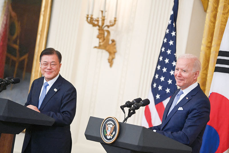 拜登政府的新供應鏈重組中未提韓國。5月分文在寅(左)急忙到美國去見拜登,目的就是韓國要重新回到美國的高端供應鏈的隊伍中。圖為5月21日美韓雙邊領袖會談。(Brendan Smialowski / AFP)