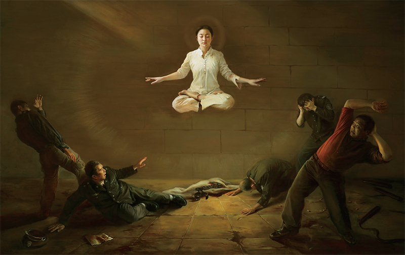 〈震撼〉,陳肖平,2009年。創作靈感來自大陸法輪功學員的真實經歷。善良和純淨戰勝了邪惡和酷刑。(真善忍美展)